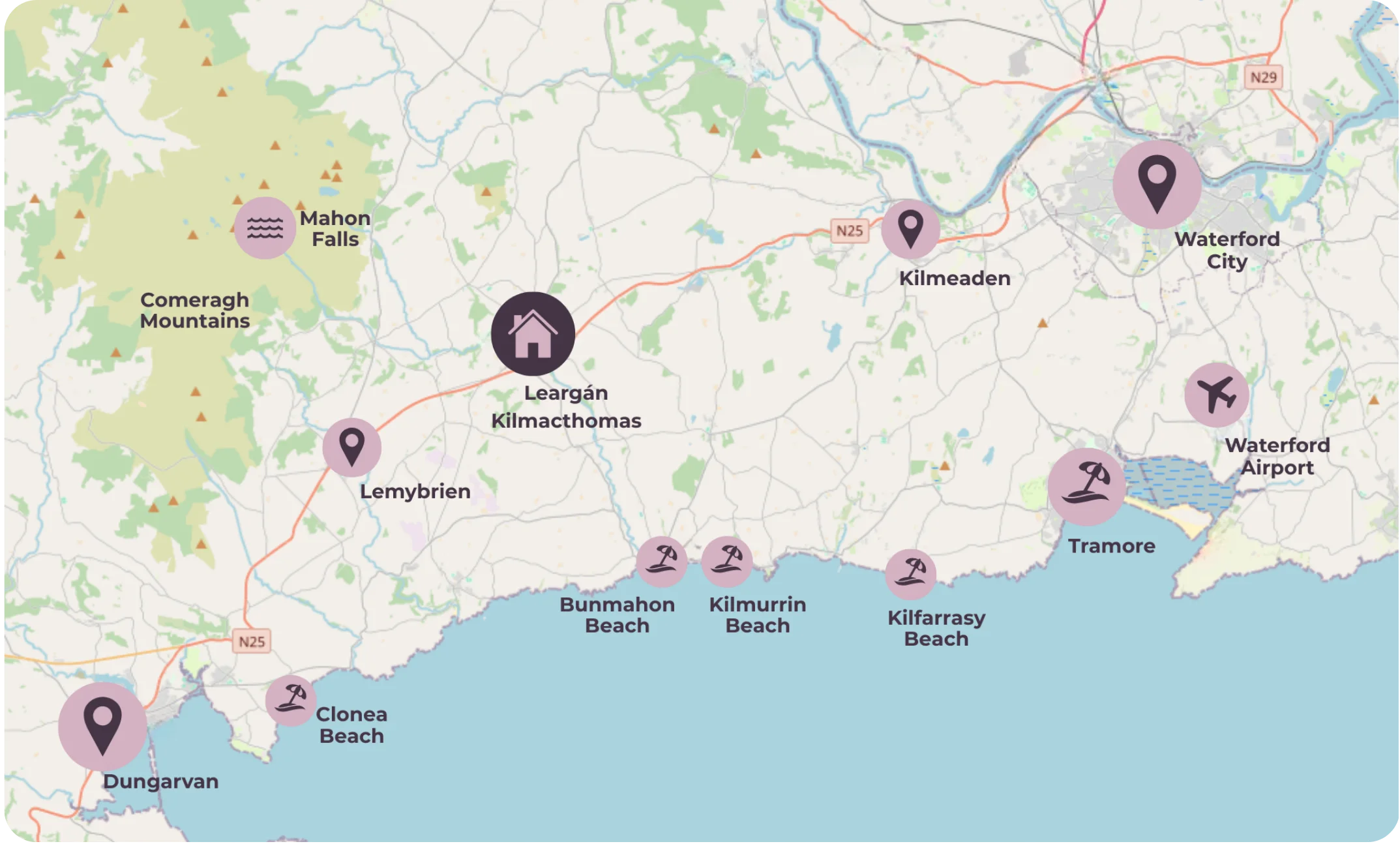 Located just moments from the Waterford Greenway and Coumshingaun Lake, Leargán offers residents a welcoming community vibe with hassle-free access to both Waterford City and Dungarvan. The area boasts a lively local scene full of independent businesses and heritage charm, creating the perfect setting for modern living.